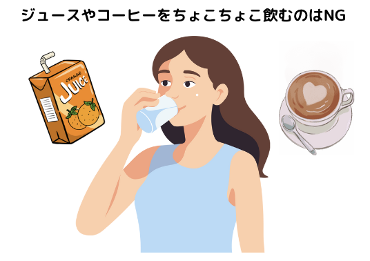 決してジュースを飲んではいけないや、コーヒーを飲んではいけないというわけではありませんが、水やお茶以外の飲み物は、きちんと時間を決めて飲むことが大切です。