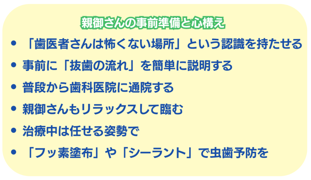 お子さんの抜歯が怖い、という気持ちを和らげるために、親御さんができることはたくさんあります。