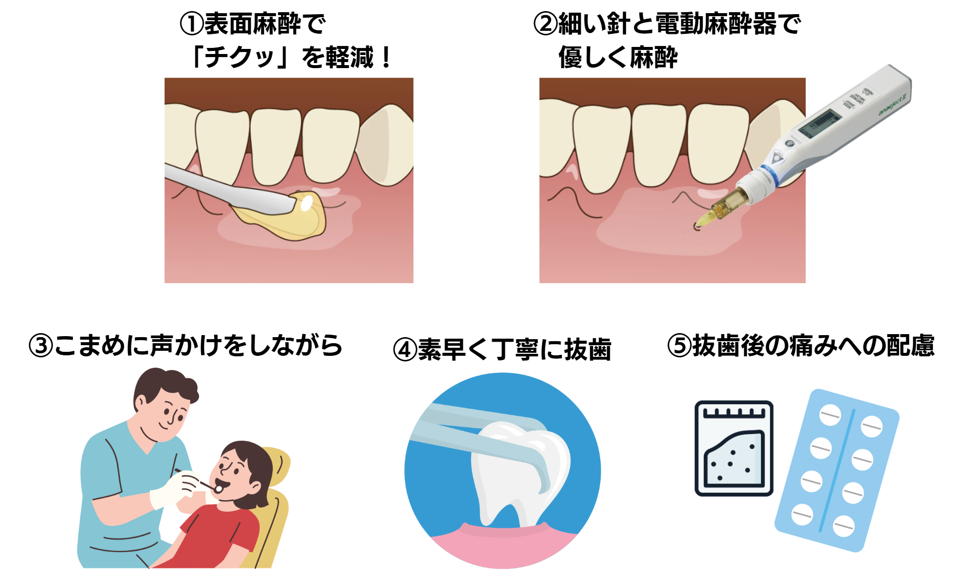 - 細い針と電動麻酔器で優しく麻酔