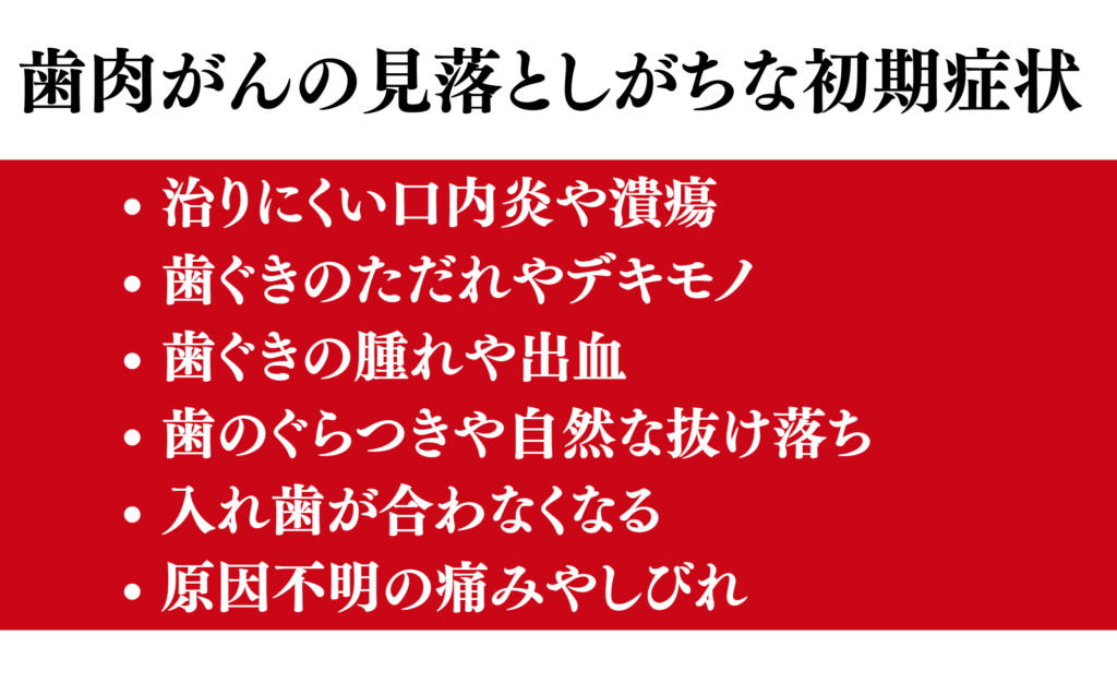 - 初期には痛みがないことも多く、ただの口内炎や歯周病だと思い込んでしまい、発見が遅れるケースも少なくありません。