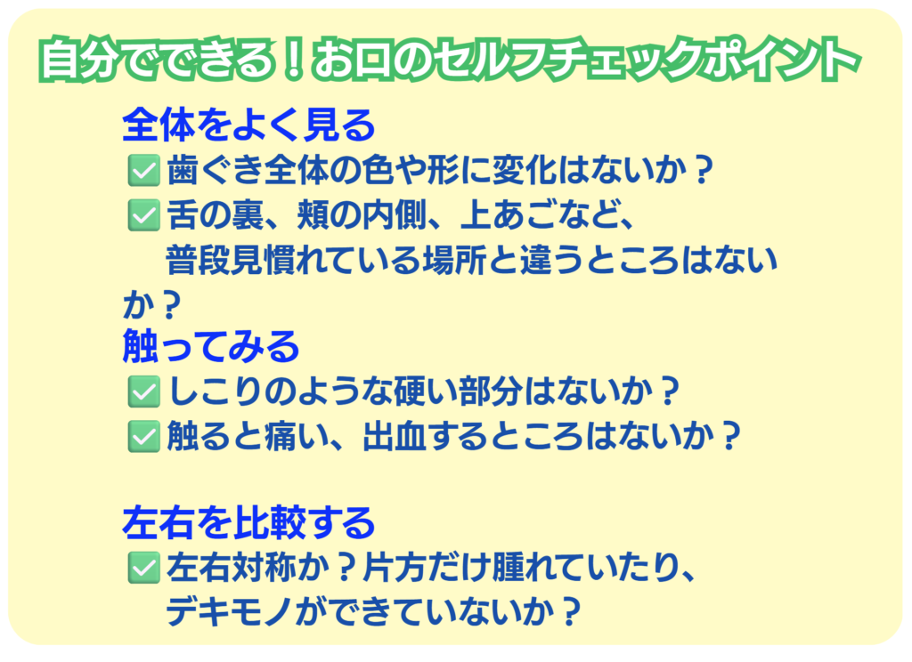 - 舌の裏、頬の内側、上あごなど、普段見慣れている場所と違うところはないか?