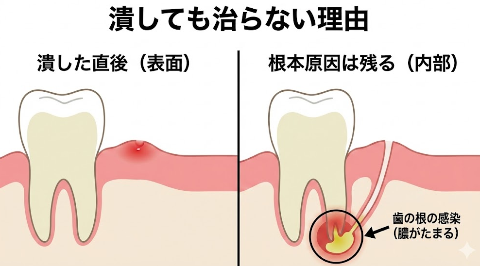 - 膿が一時的に排出されただけ