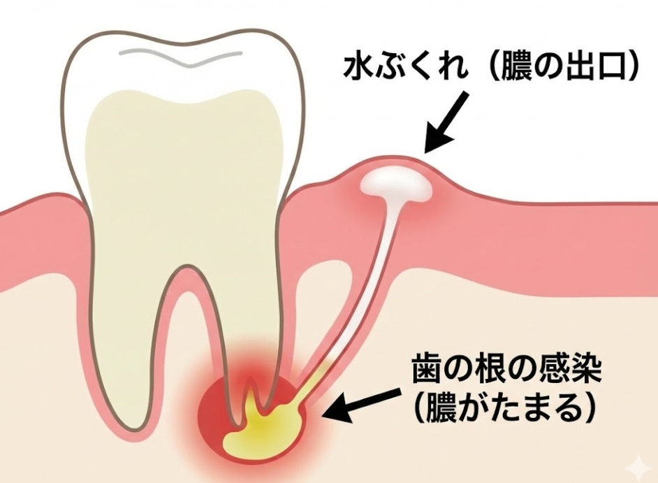 歯の根の先に感染があり、その出口として歯茎に水ぶくれができている状態です。