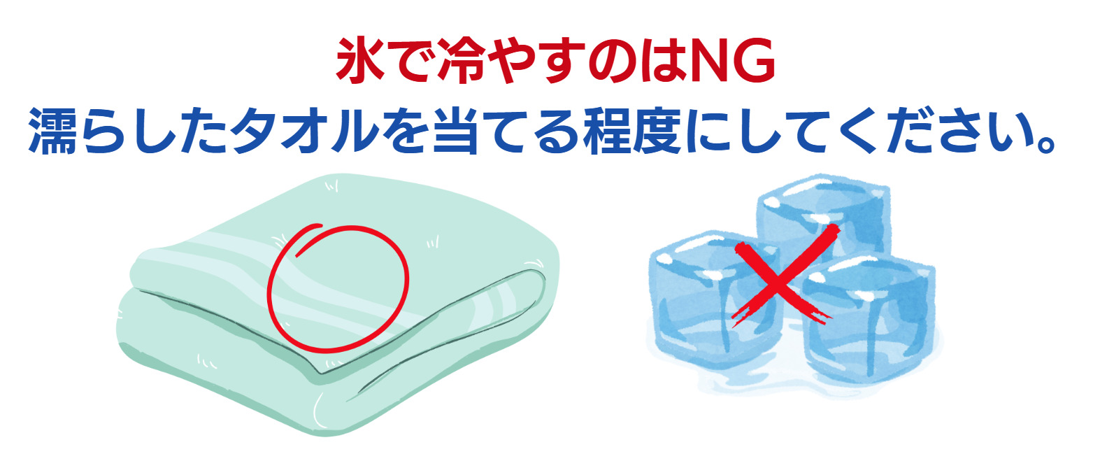 ➡ 氷を直接当てるのはよくありません。濡らしたタオルをお輝程度にしてください。
