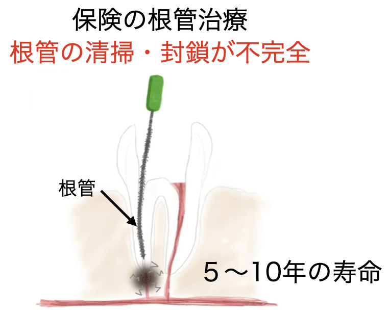 保険治療では、使用する器具や時間に制限があるため、根管の清掃・封鎖が不完全になるケースが多く、再感染のリスクが高くなりがちです。