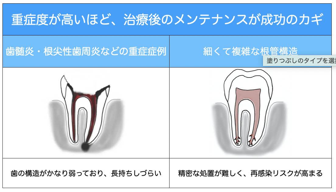 重症度が高いほど、治療後のメンテナンスが成功のカギとなります。