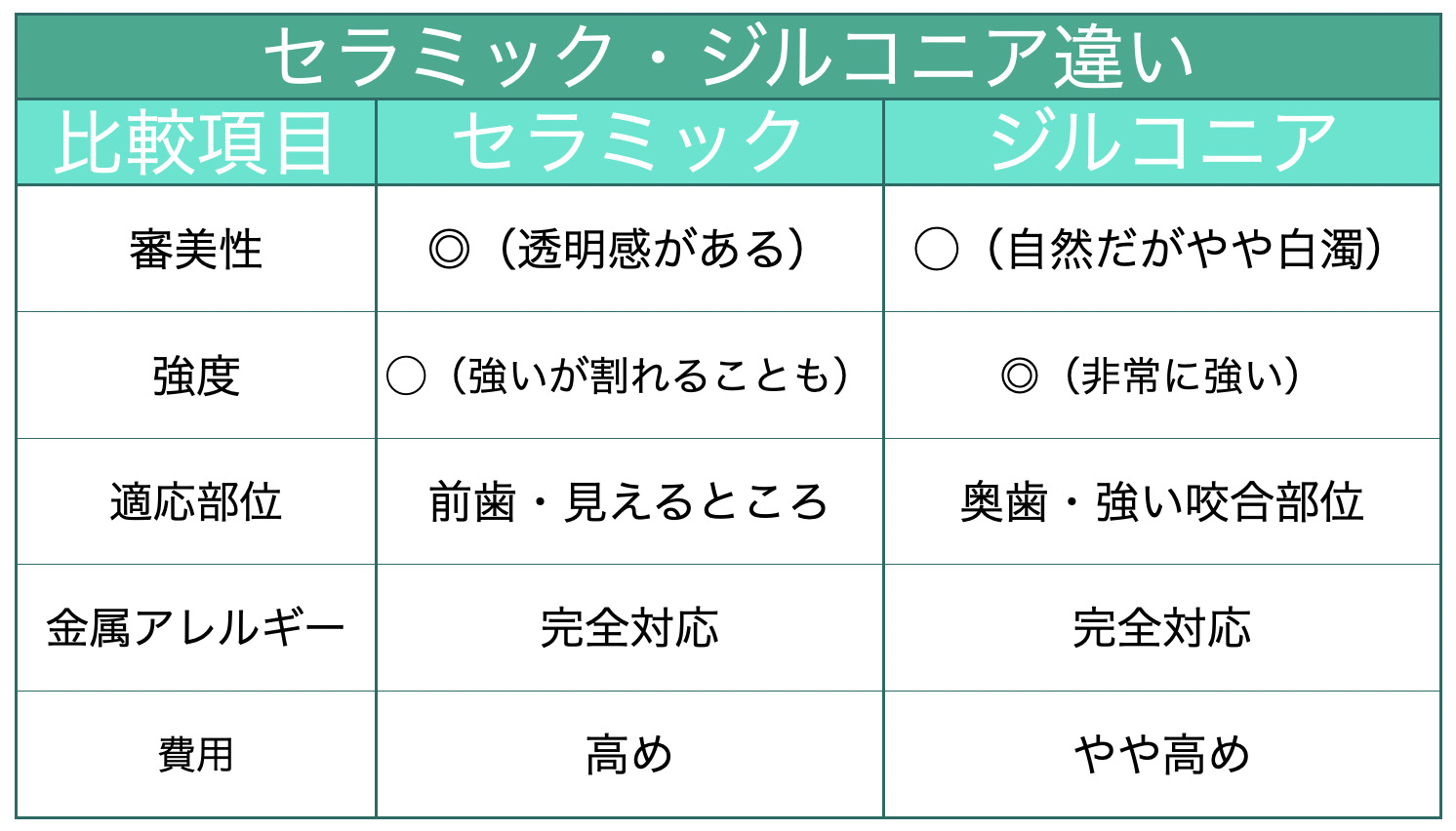 👉 見た目重視=セラミック、強度重視=ジルコニアが基本的な考え方です。審美性と耐久性のバランスを見て選びましょう。