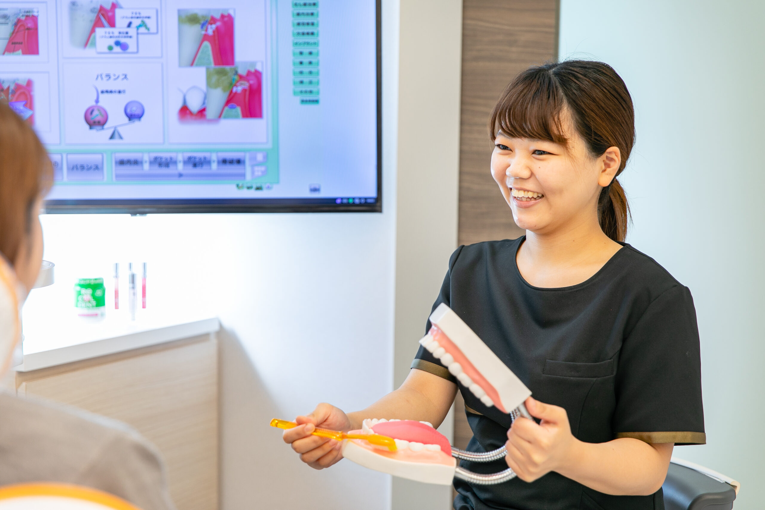 歯並びやお口の中の状態を確認し、それぞれに合った歯磨きの仕方をお伝えし、毎日の歯磨きでプラークを除去できるようにしていきます。